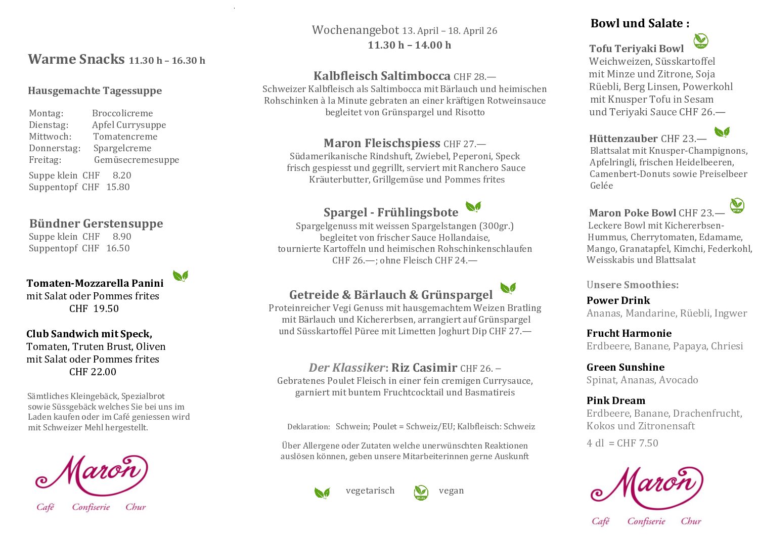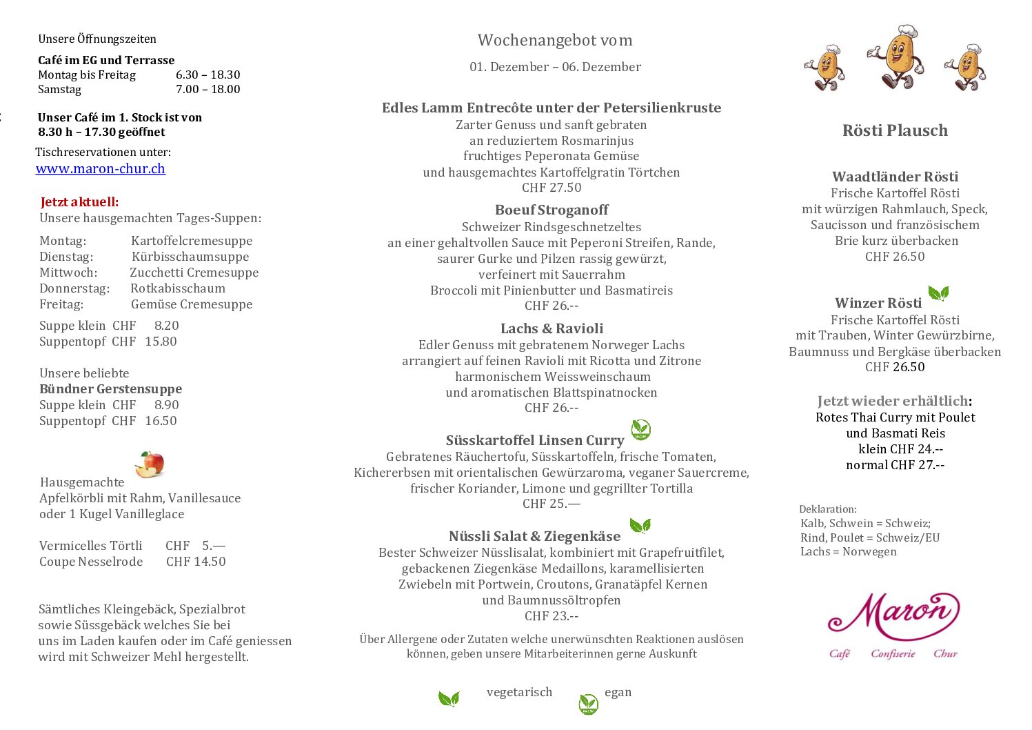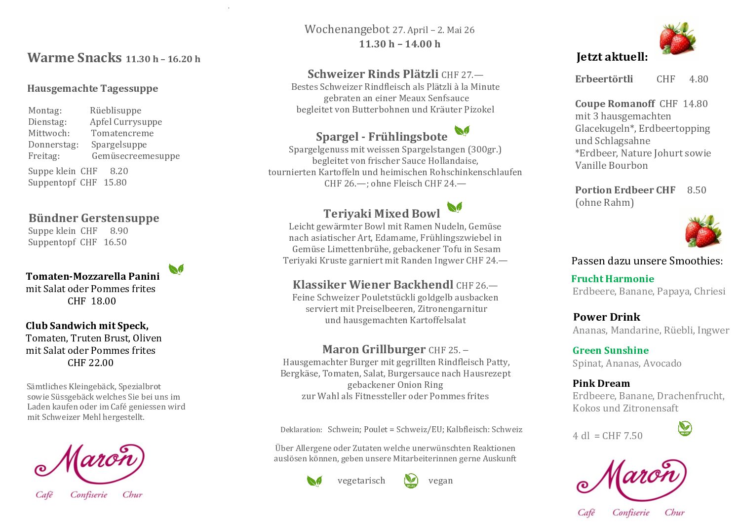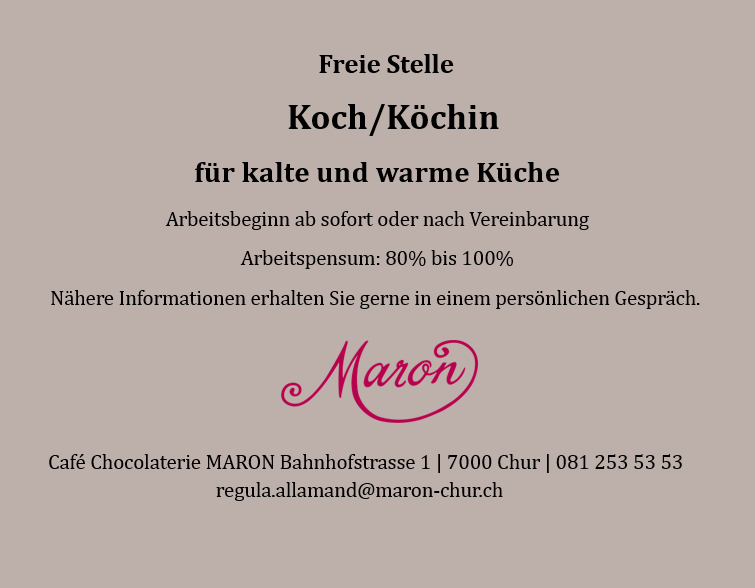 Herzlich Willkommen im MARONMaron am MittagMittagsmenü Speisekarte Zur Tischreservation Online-ShopZum Onlineshop Zum Geschenkflyer Zum Tortenflyer Zum Apéroflyer AktuellFreie Stellen