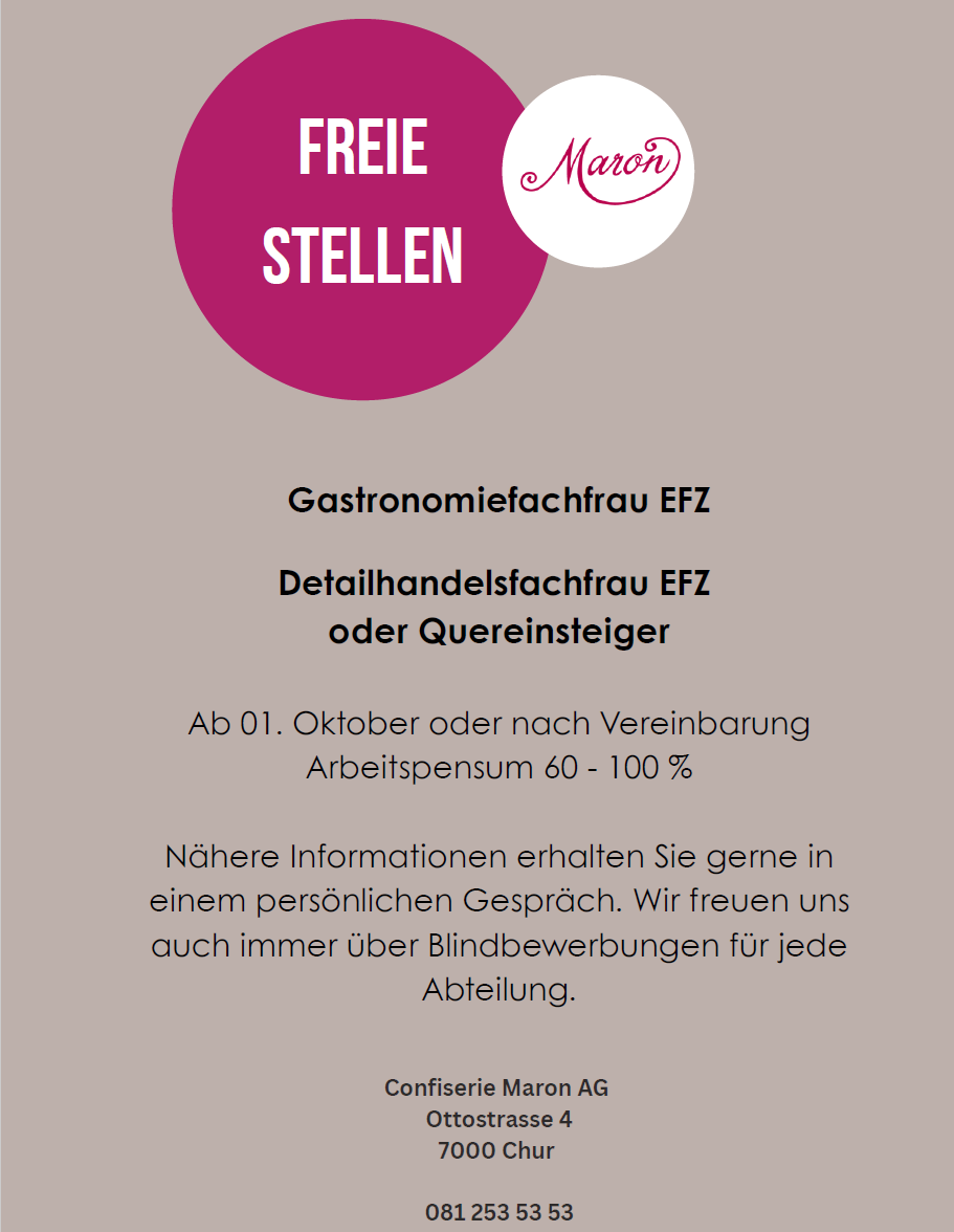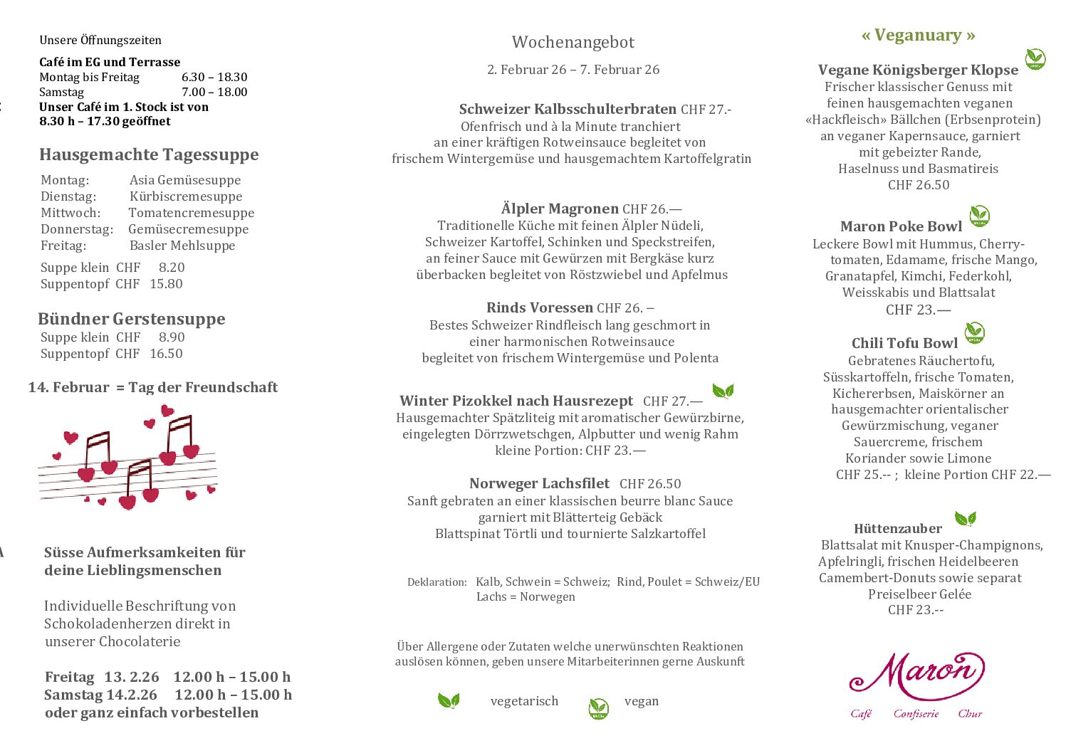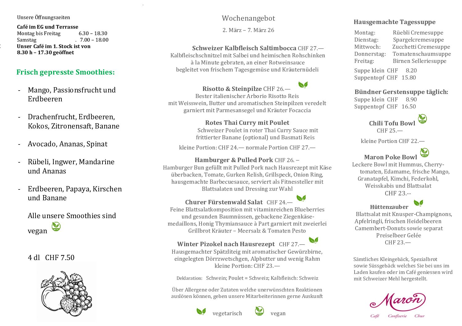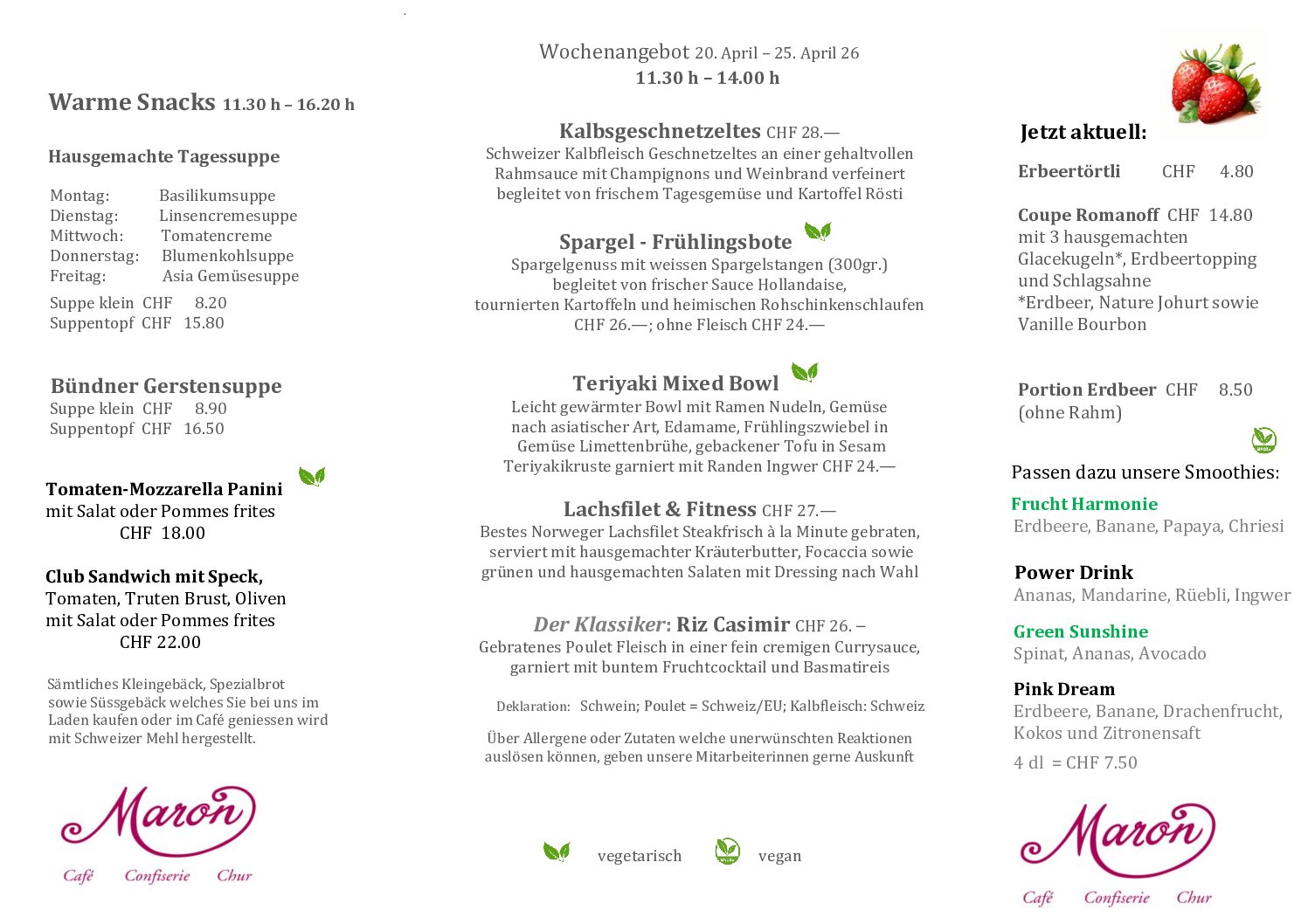 Herzlich Willkommen im MARONMaron am MittagMittagsmenü Speisekarte Zur Tischreservation Online-ShopZum Onlineshop Zum Geschenkflyer Zum Tortenflyer Zum Apéroflyer AktuellFreie Stellen